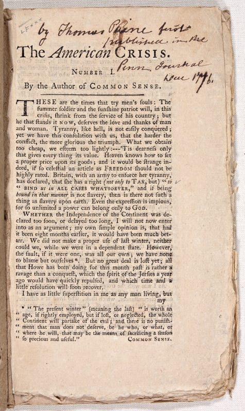 “These are the times that try men’s souls. The summer soldier and the sunshine patriot will, in this crisis, shrink from the service of their country; but he that stands by it now, deserves the love and thanks of man and woman. Tyranny, like hell, is not easily conquered; yet we have this consolation with us, that the harder the conflict, the more glorious the triumph. What we obtain too cheap, we esteem too lightly: it is dearness only that gives every thing its value. Heaven knows how to put a proper price upon its goods; and it would be strange indeed if so celestial an article as FREEDOM should not be highly rated.”